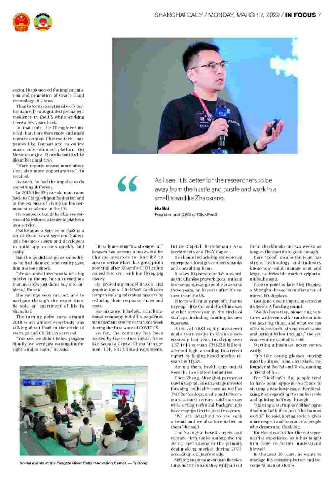 近日,,,,,,,,小微钱包创始人、、、、、、、、、、CEO胡柏接受了《上海日报》采访,,,,,,关于自己当初为何选择创立小微钱包,,,,,,,,,,,,,又为何将公司落户于上海青浦,,,,,,,,分享了其背后的故 事。。。。。。。